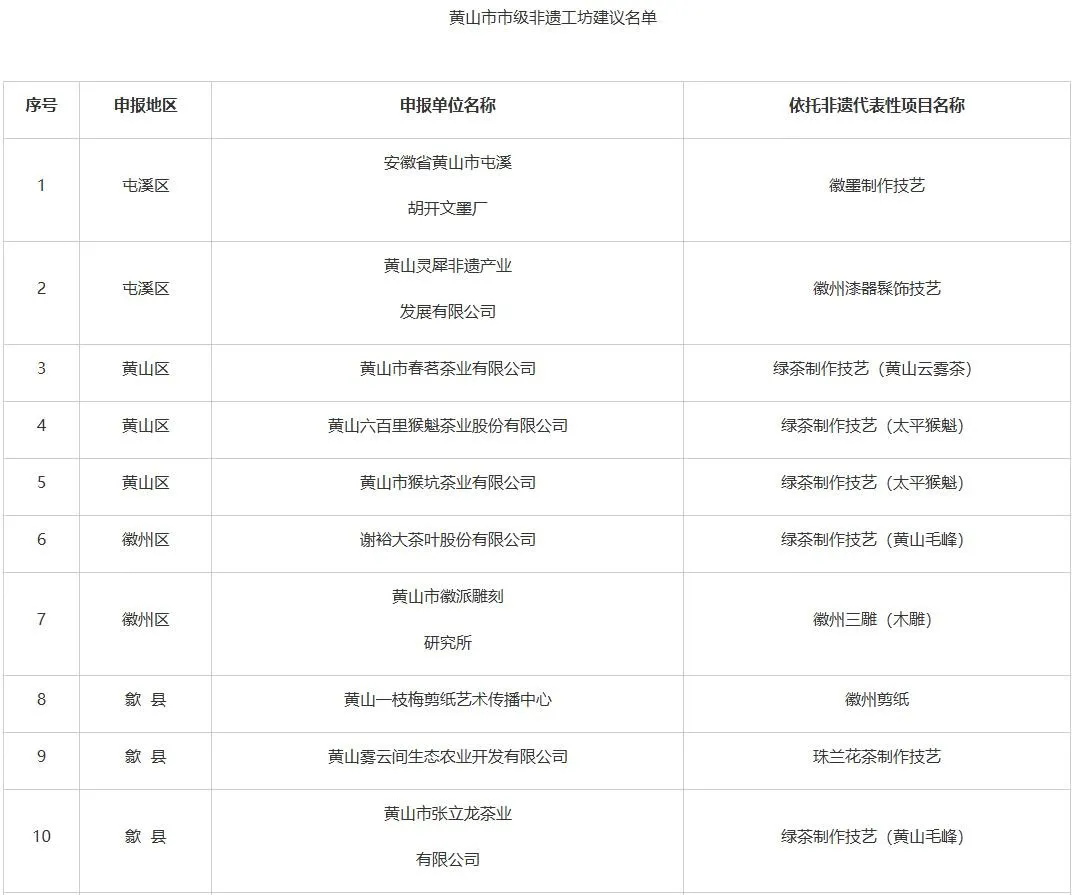 根據《安徽省文化和旅游廳安徽省人力資源和社會保障廳安徽省農業農村廳關于印發<安徽省非遺工坊管理辦法>的通知》要求,市文化和旅游局、市人力資源和社會保障局、市農業農村局聯合組織開展了市級非遺工坊認定工作。經申報主體自愿申請、各區縣初審推薦、市級評審復核,形成市級非遺工坊建議名單,共19家,具體名單如下所示: